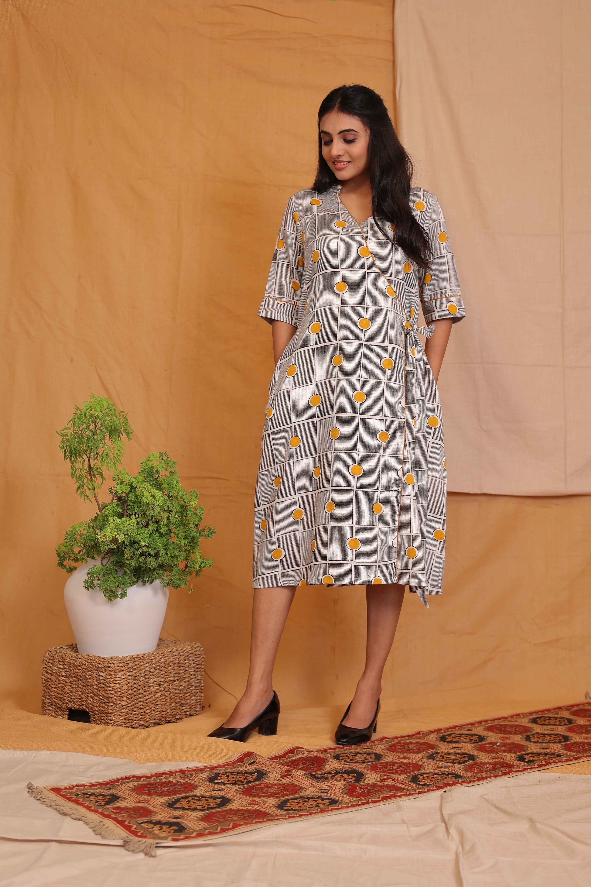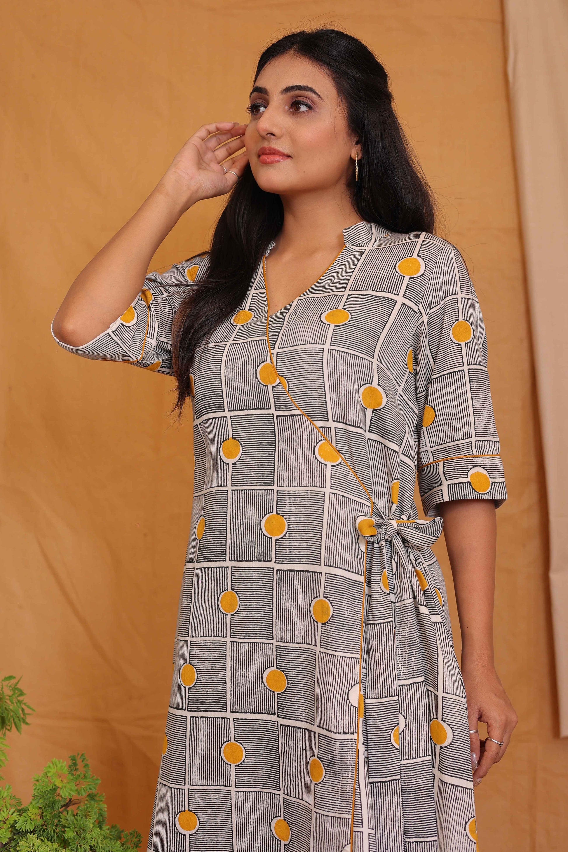 Make an impression with this blockprinted dress featuring our signature lines in crisp white and black, brought to life with playful mustard dots. The stand collar and unique overlapping pattern lend an unmistakable grace to the silhouette. Crafted from breathable cotton, this versatile piece ensures airy comfort all day long. Easily style it as an elegant dress or as a chic kurta with your favorite bottoms. The artisanal blockprinting technique adds a sense of authenticity and timeless artistry. Embrace a refined, modern look where craftsmanship and effortless style meet beautifully.