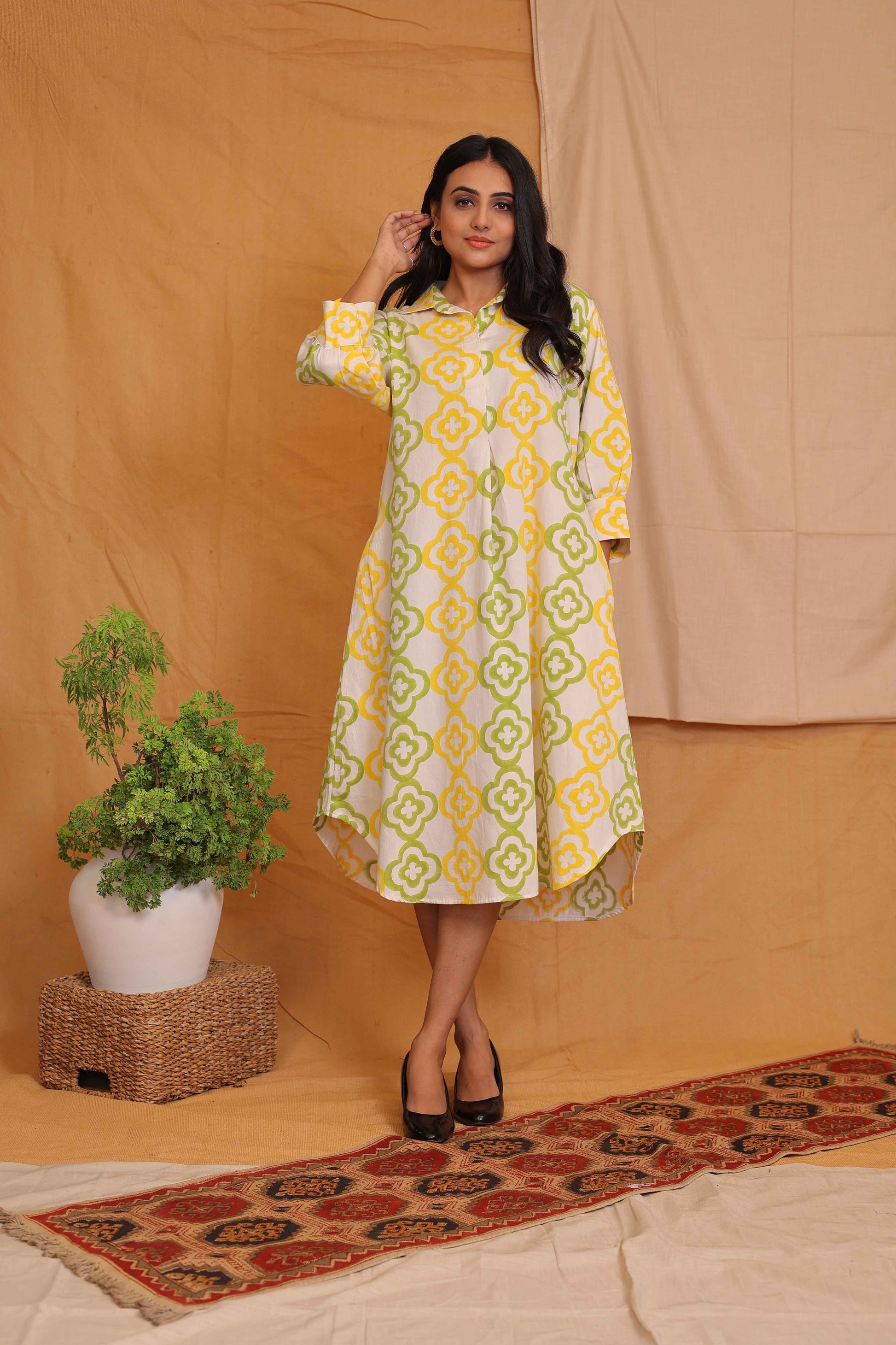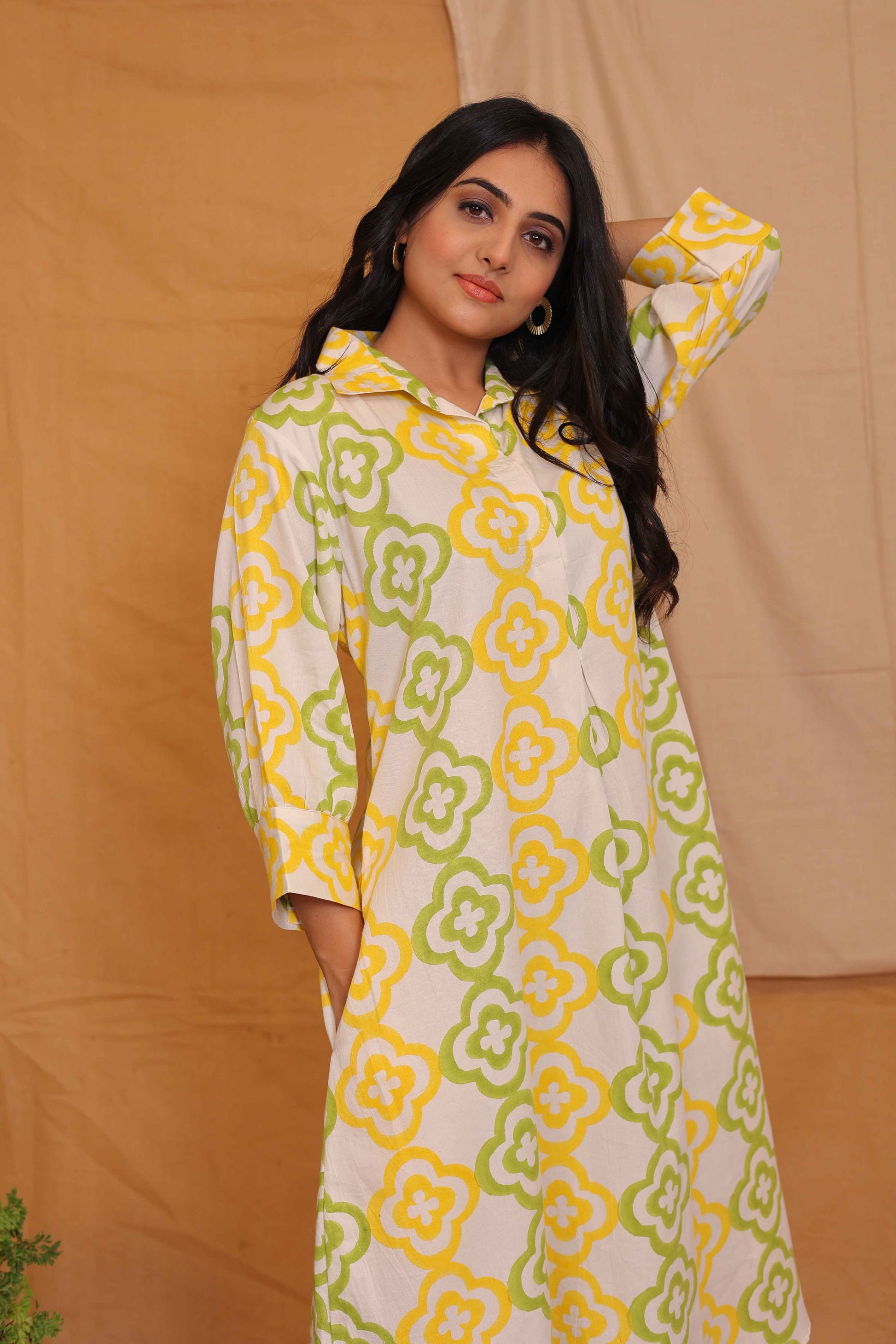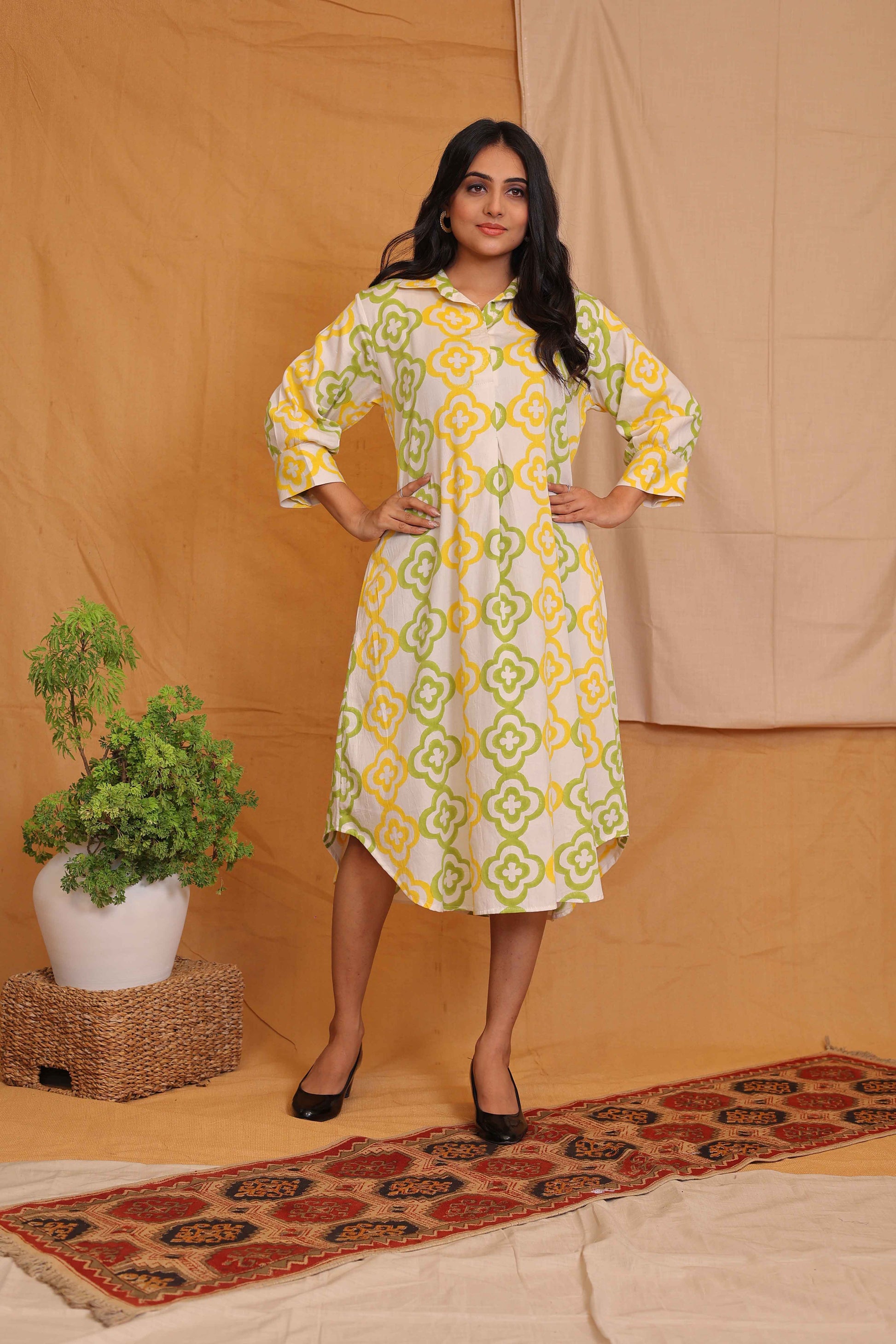 JASMINE'S OFFWHITE YELLOW GREEN HANDBLOCKPRINTED COLLAR DRESS